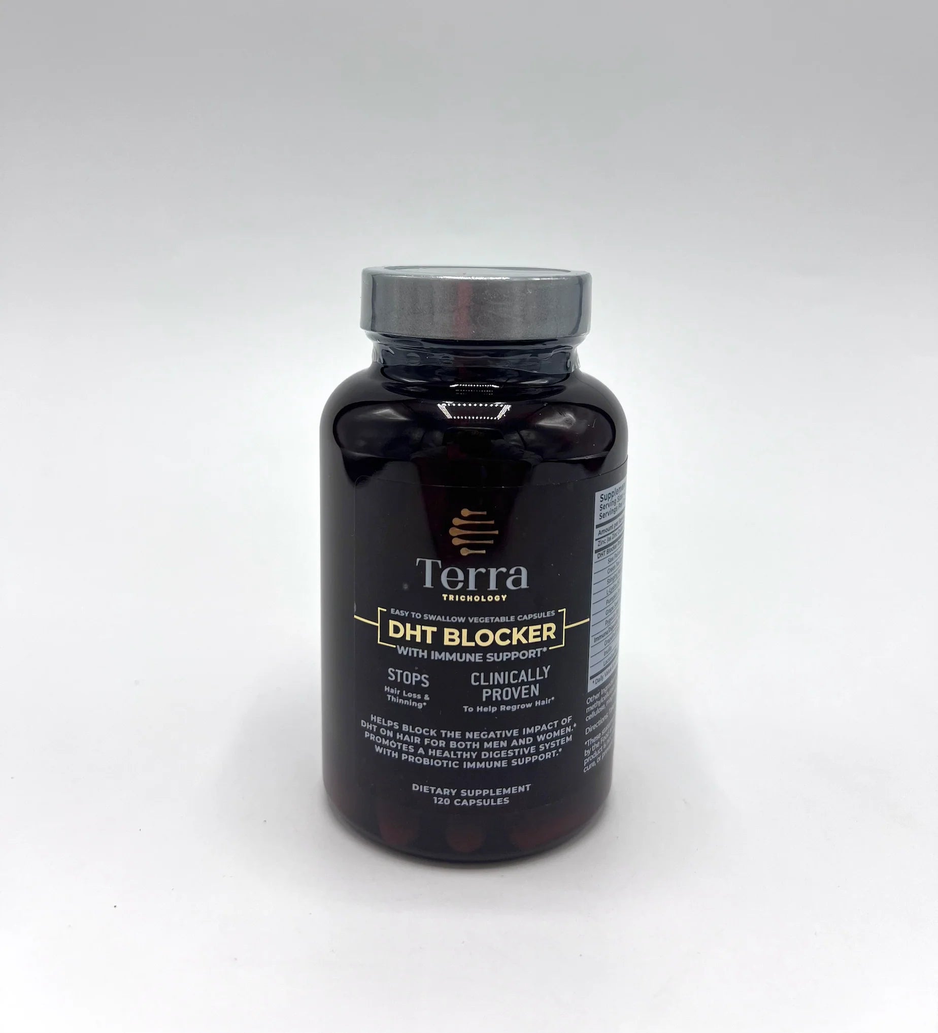 Clinically recognized DHT blocker supplement developed by Terra Trichology. Supports blocking of the negative impact of DHT on the hair for both men and women.*
